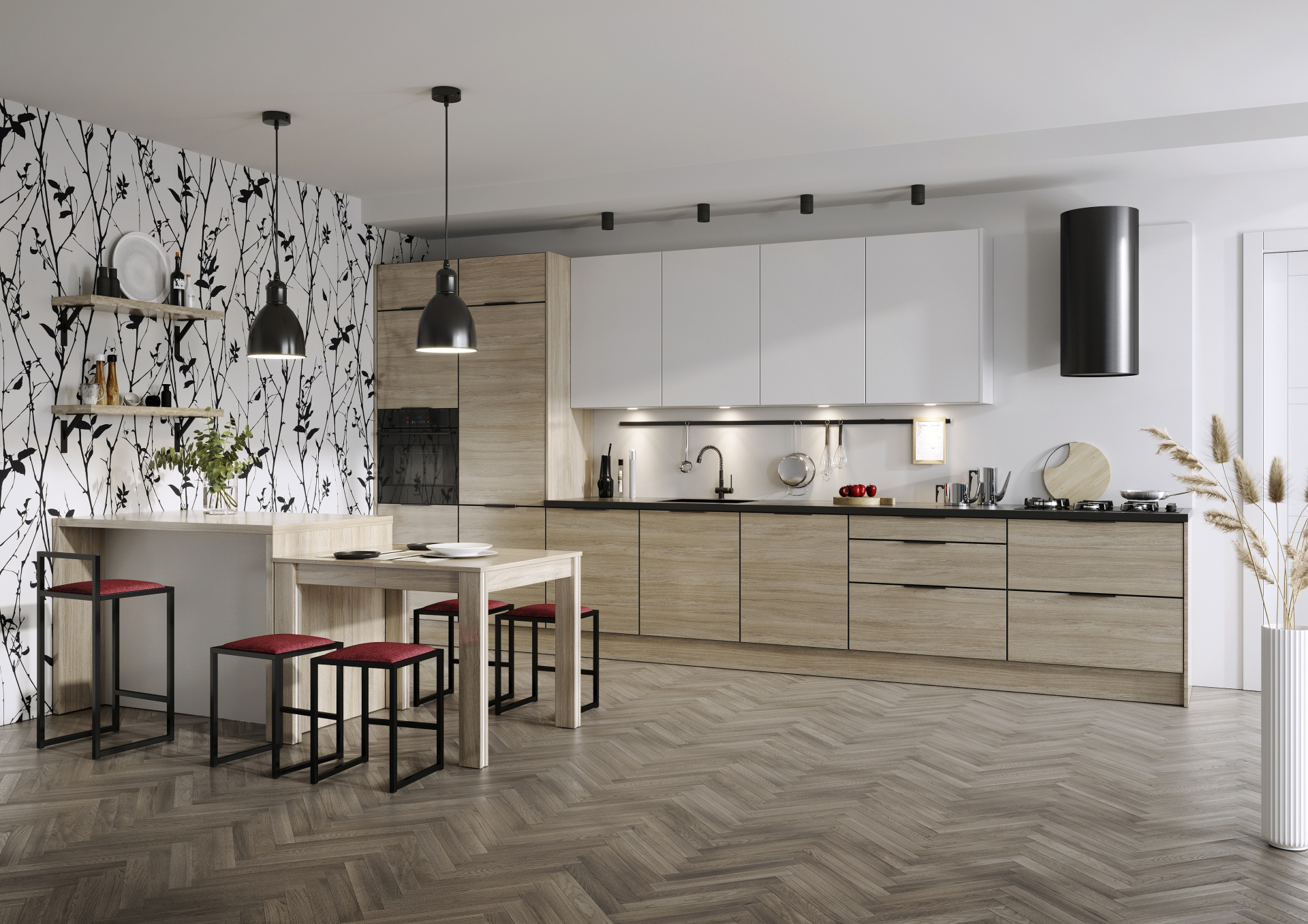 – W takiej roli sprawdzi się już wyspa z blatem o długości 120 cm i szerokości 80 cm – mówi Sylwia Kowalska-Mikutel, projektantka Spółki Meblowej KAM. – Taki nieduży model dostępny w naszym systemie KAMmono jest praktyczny, ponieważ jednocześnie pełni funkcję powierzchni roboczej, na której możemy przygotowywać posiłki i zastępuje stół, na który brakuje miejsca w małych kuchniach. Pod blatem można zamontować szafkę, dzięki czemu zyskamy dodatkowe miejsce do przechowywania.